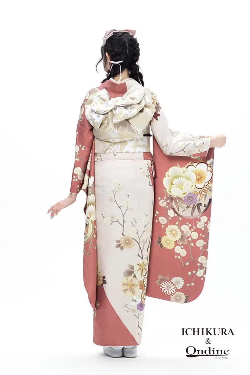 【ICHIKURA&オンディーヌ限定振袖】 くすみピンクとグレーの上品配色でしとやかに。甘いディテールを詰め込んでラブリー度アップ