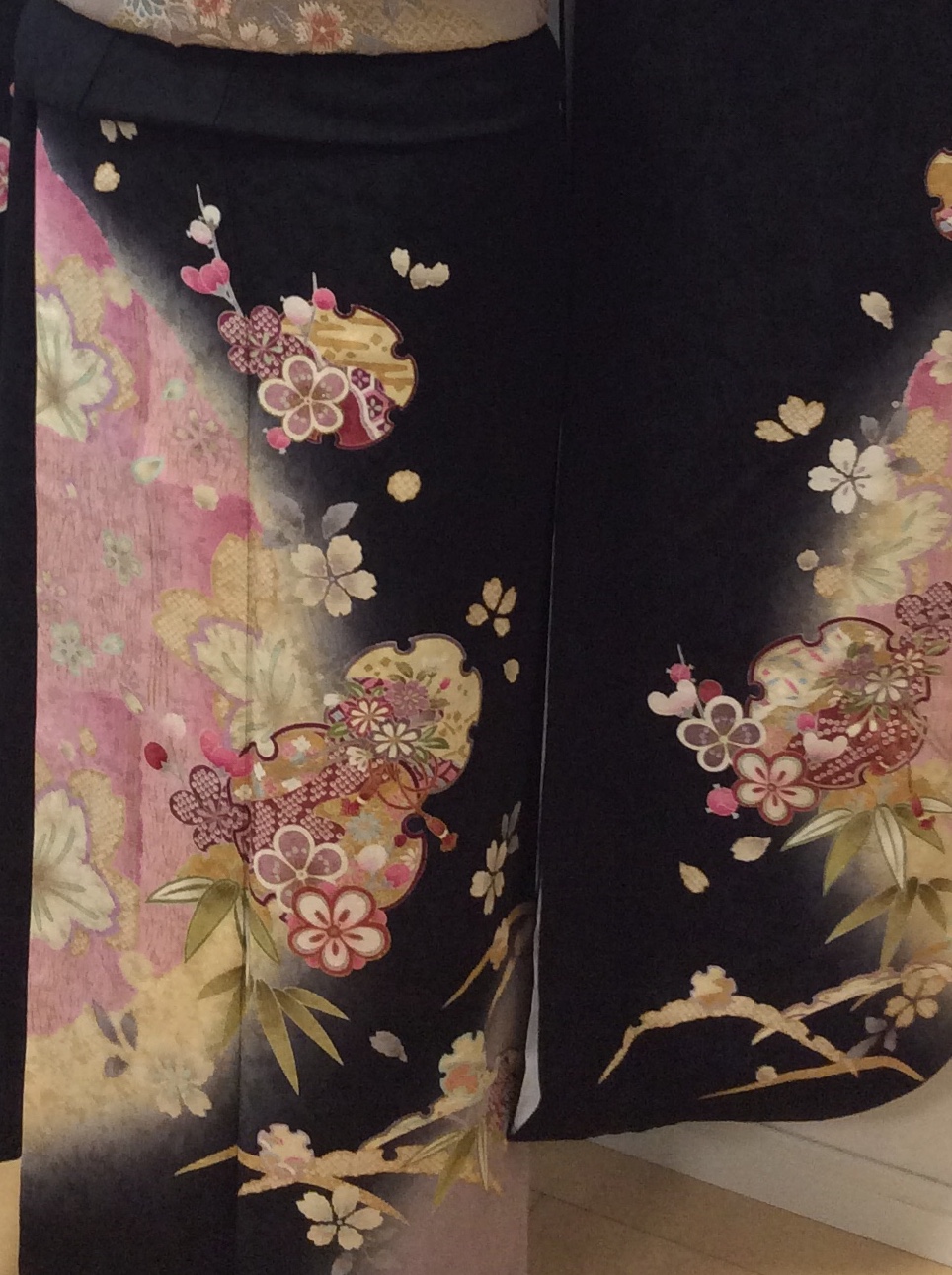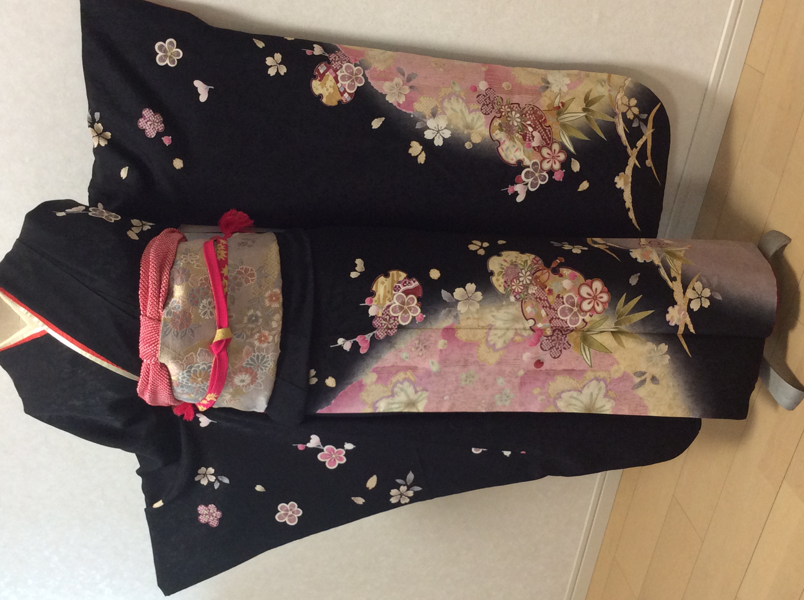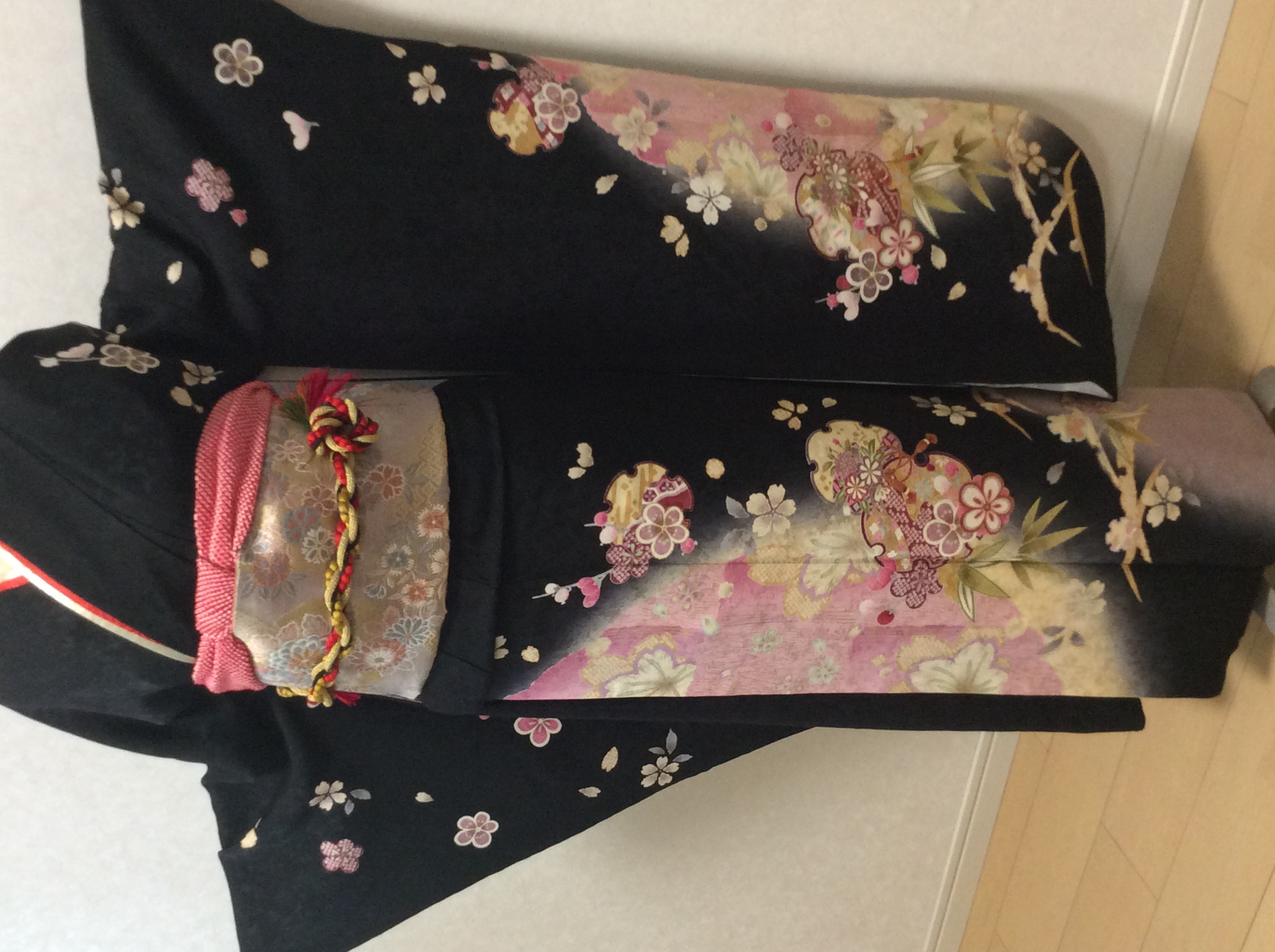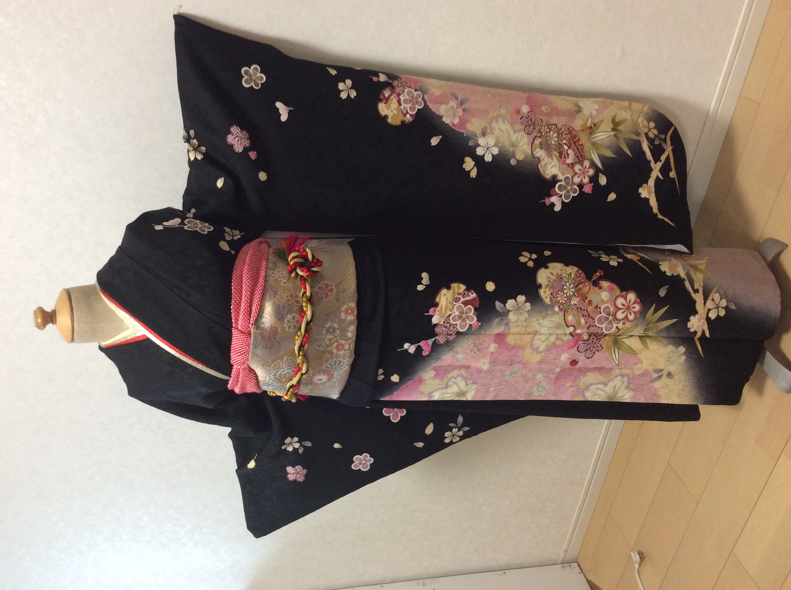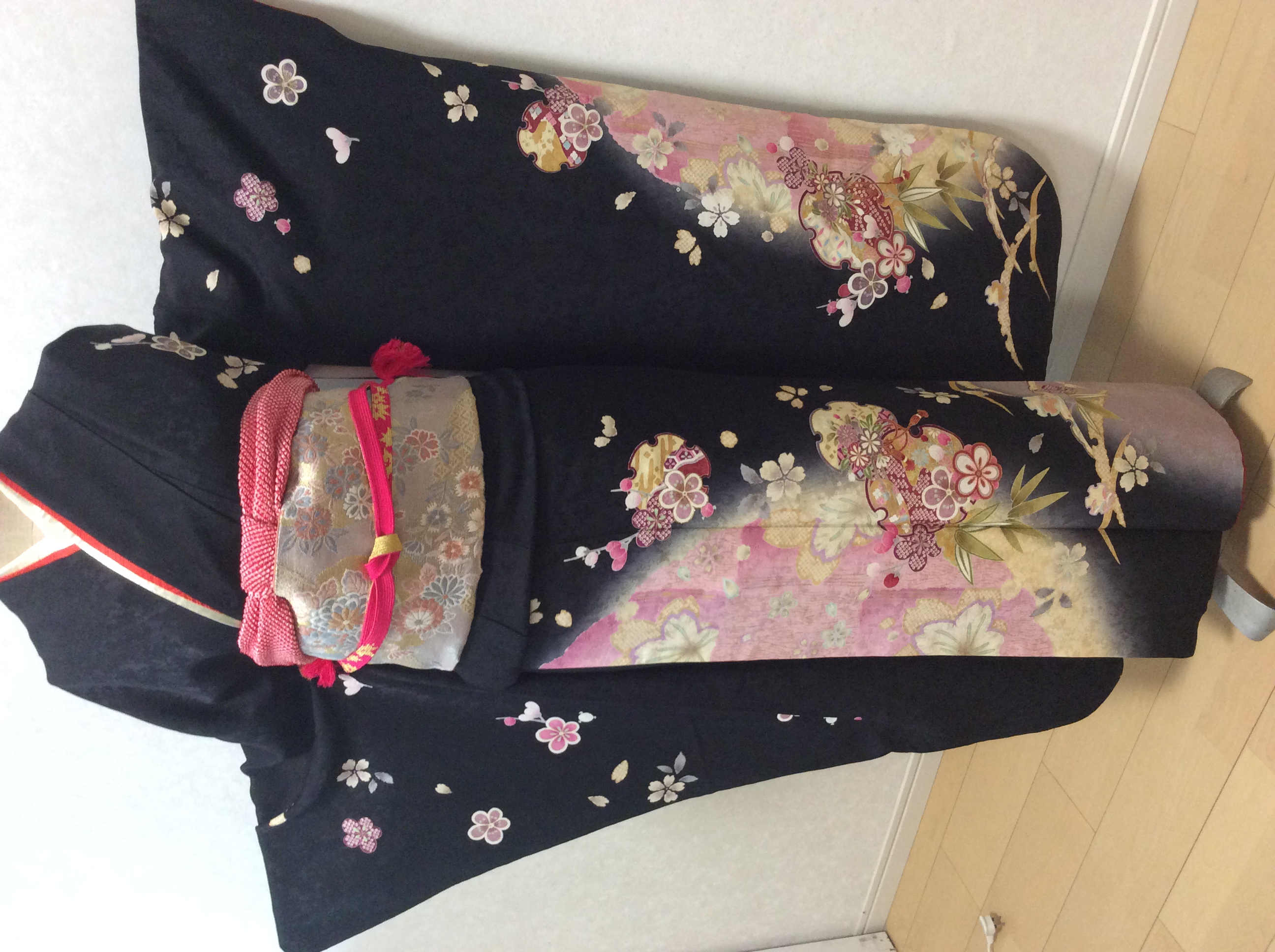 黒地にピンクの桜柄の可愛い振袖です、襟元に柄が無いので重ね襟で色々アレンジが楽しめます。 一点もので成人式当日の お嬢様が着用頂くとレンタルはできません、予約はお早めに。 お得なパックコースは衣装+着付け+ヘアセットで 59800円(税込価格) がお得で便利です。 前撮り、後撮りでの予約着用は可能です、 その他卒業式用着物+袴、七五三、付下げ、留袖、浴衣等の貸出を提供しております。