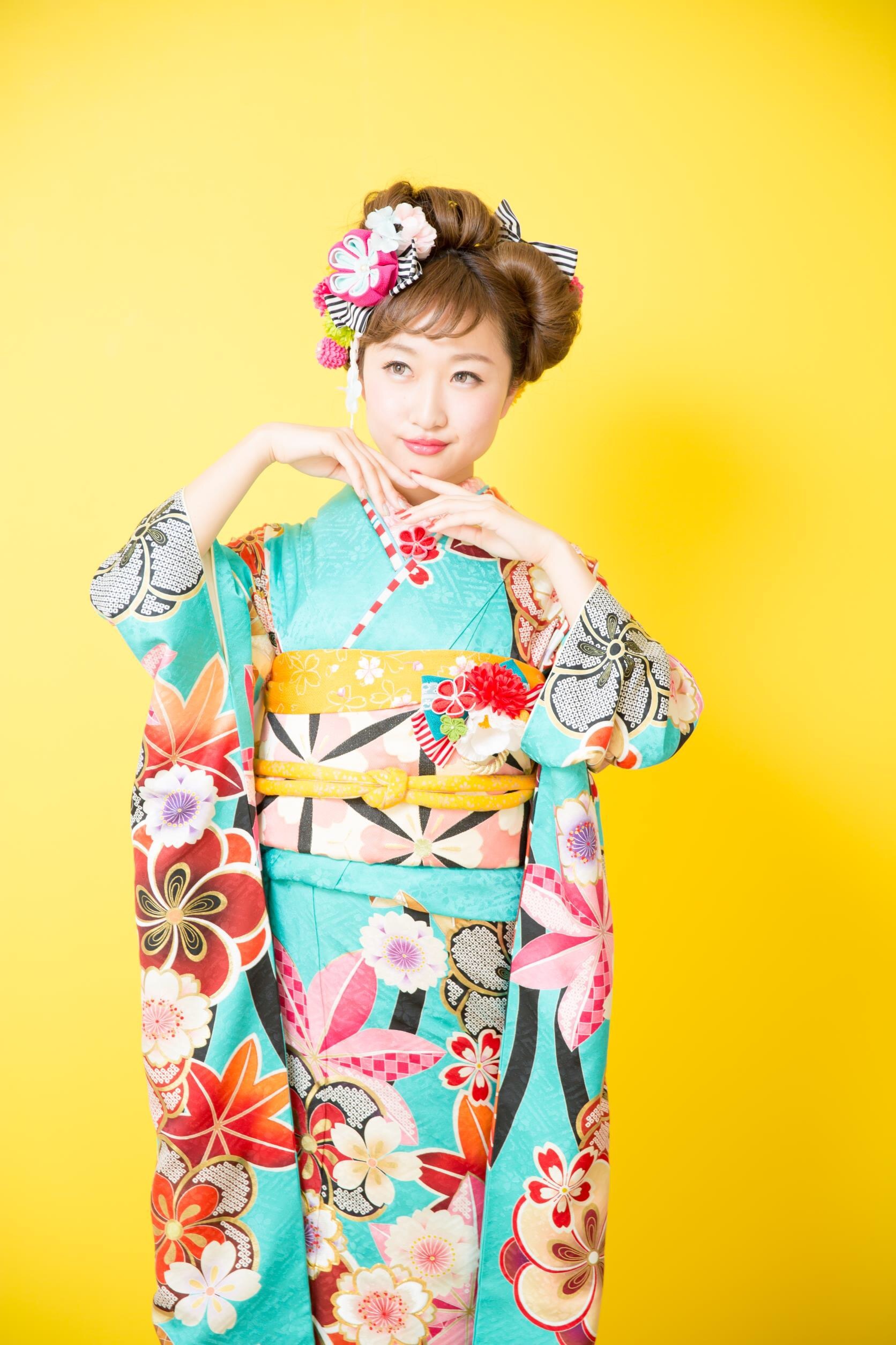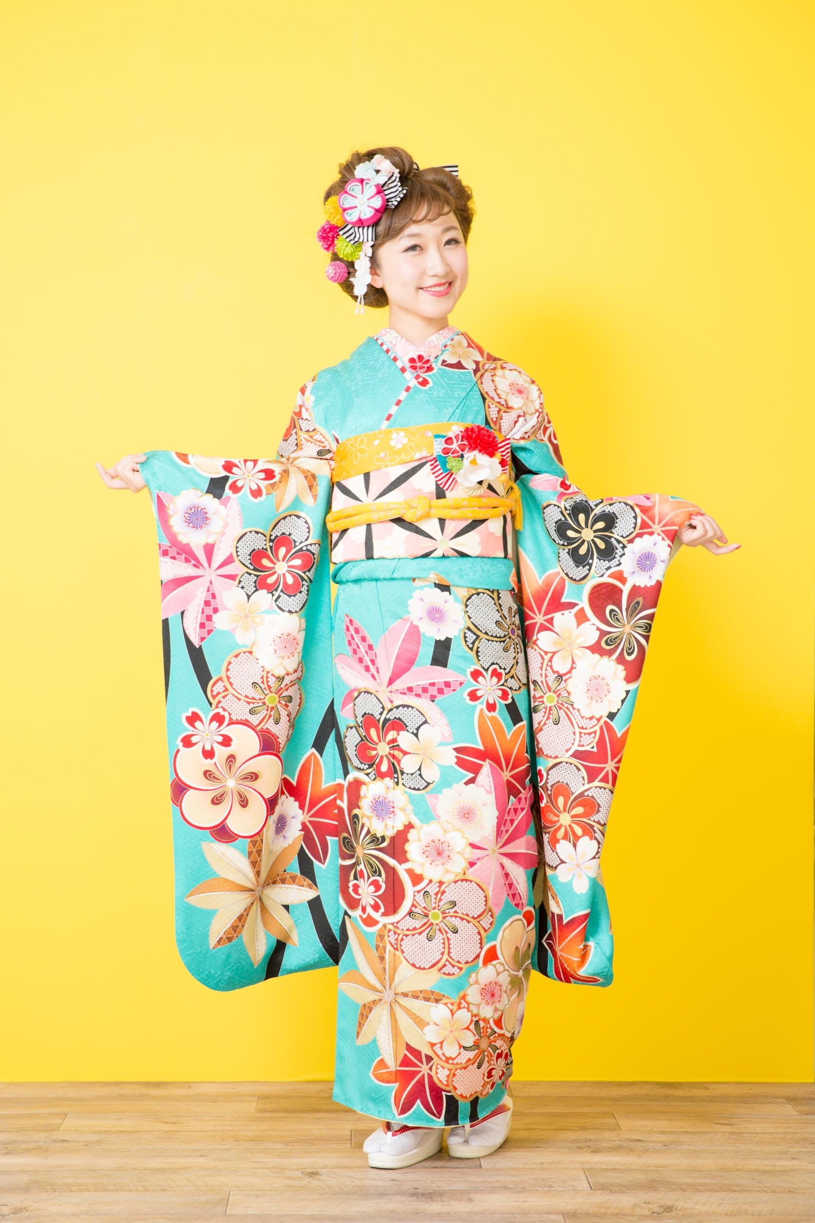 中村里砂×九重コラボ振袖。 鮮やかなターコイズブルーとビビットピンクのコントラストがたまらない一着。襟元のストライプの重ね襟がよりポップでお洒落にコーディネート!所々にあしらわれたしぼり柄が和テイストも感じさせる進化系レトロ。上品にもポップにもスタイリングできる着こなし甲斐のなる振袖。