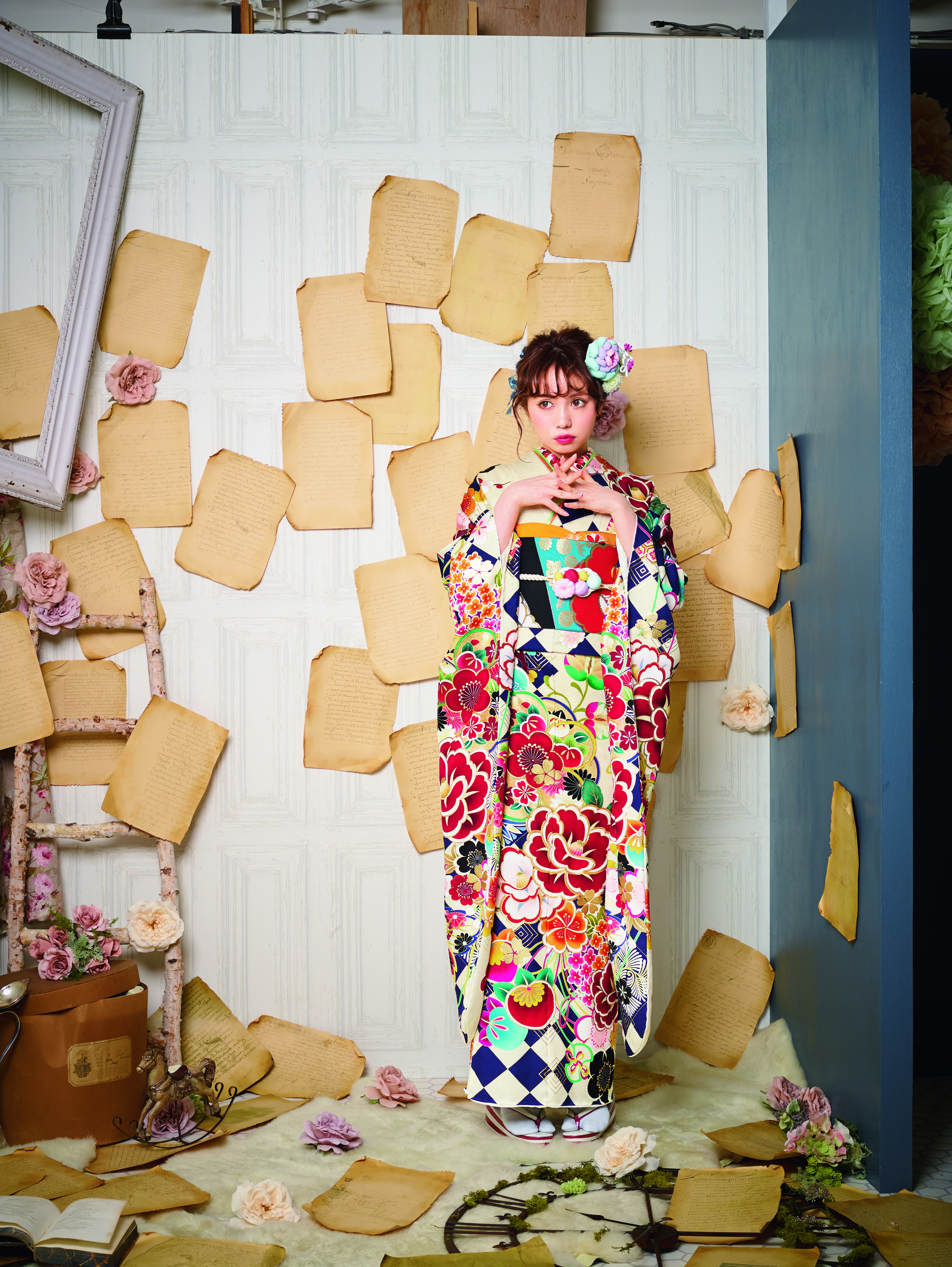 白地にダイヤ柄、大胆な大ぶりのお花をあしらった一着。 レトロ・モダン・ガーリーを全て詰め込んだカワイイ欲張りな振袖。