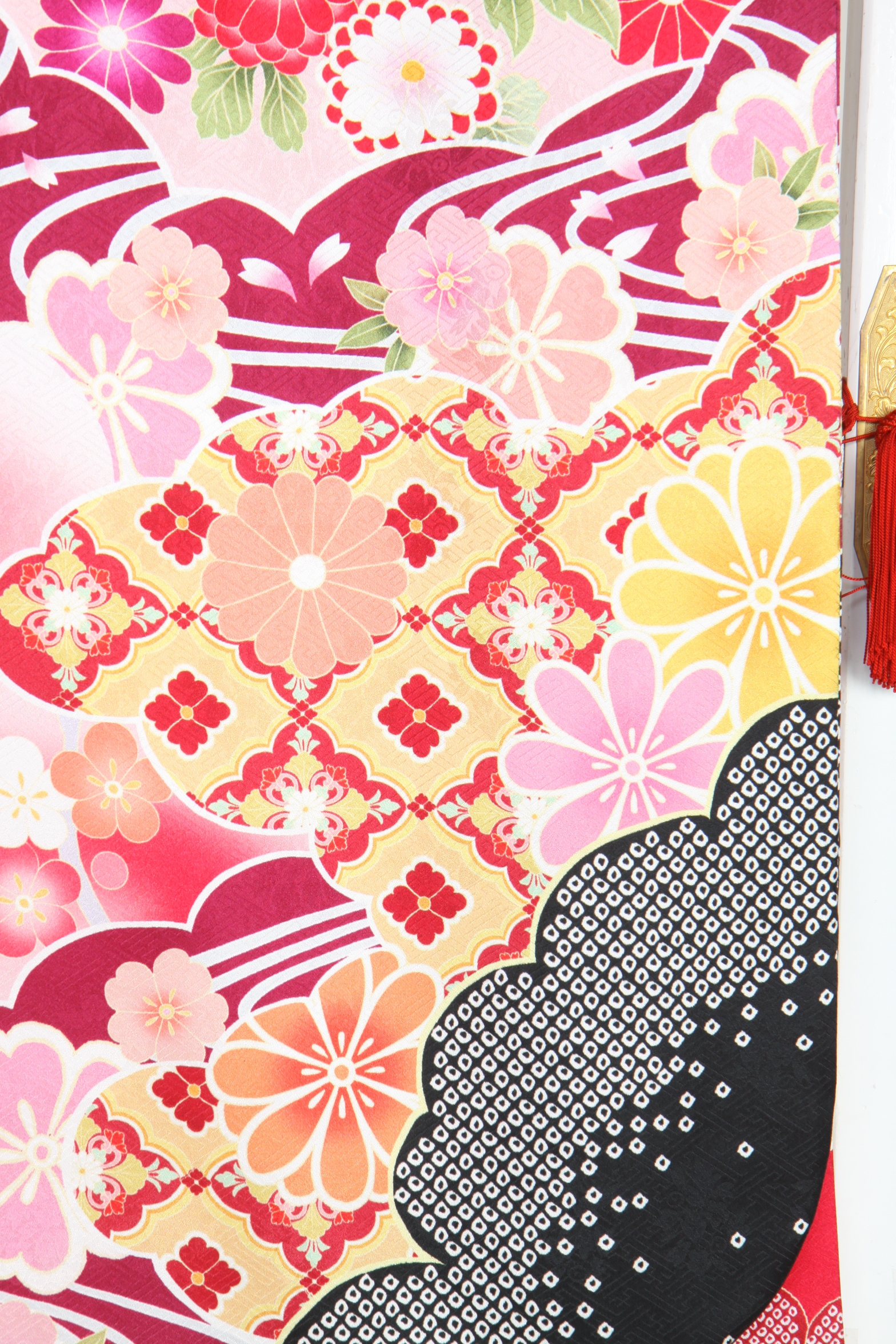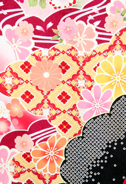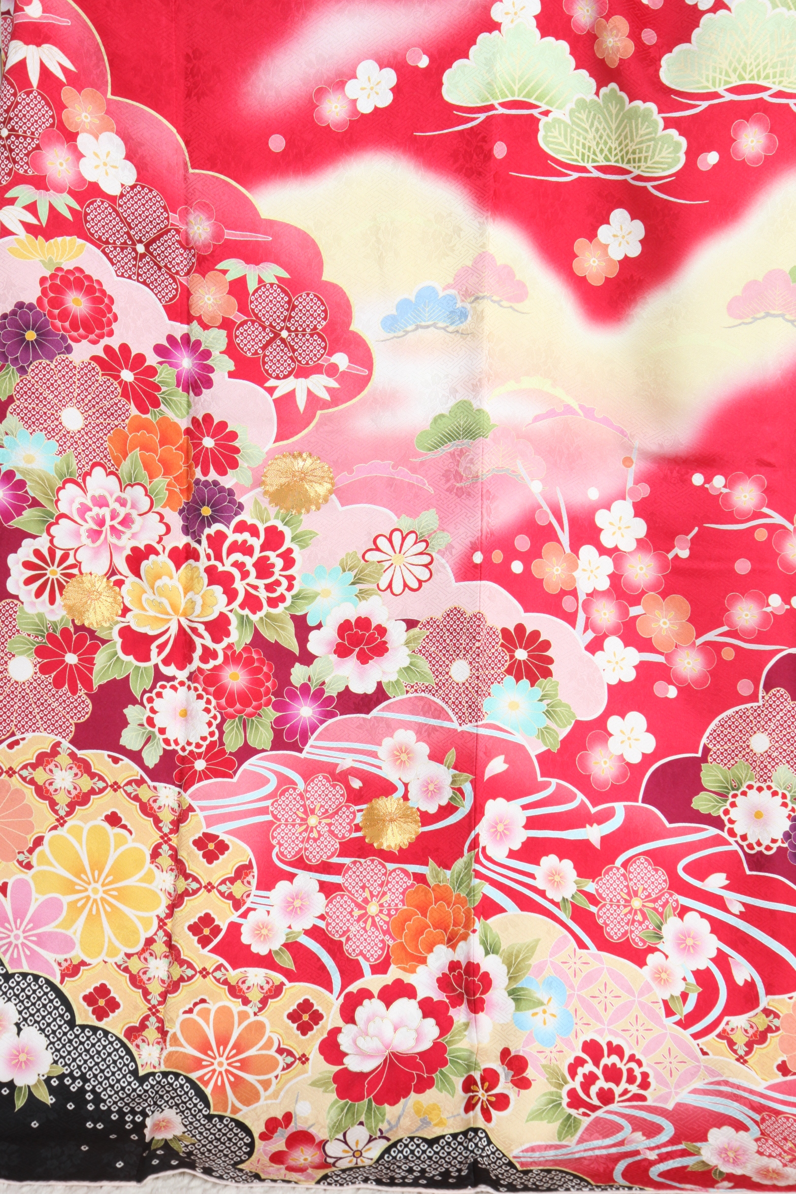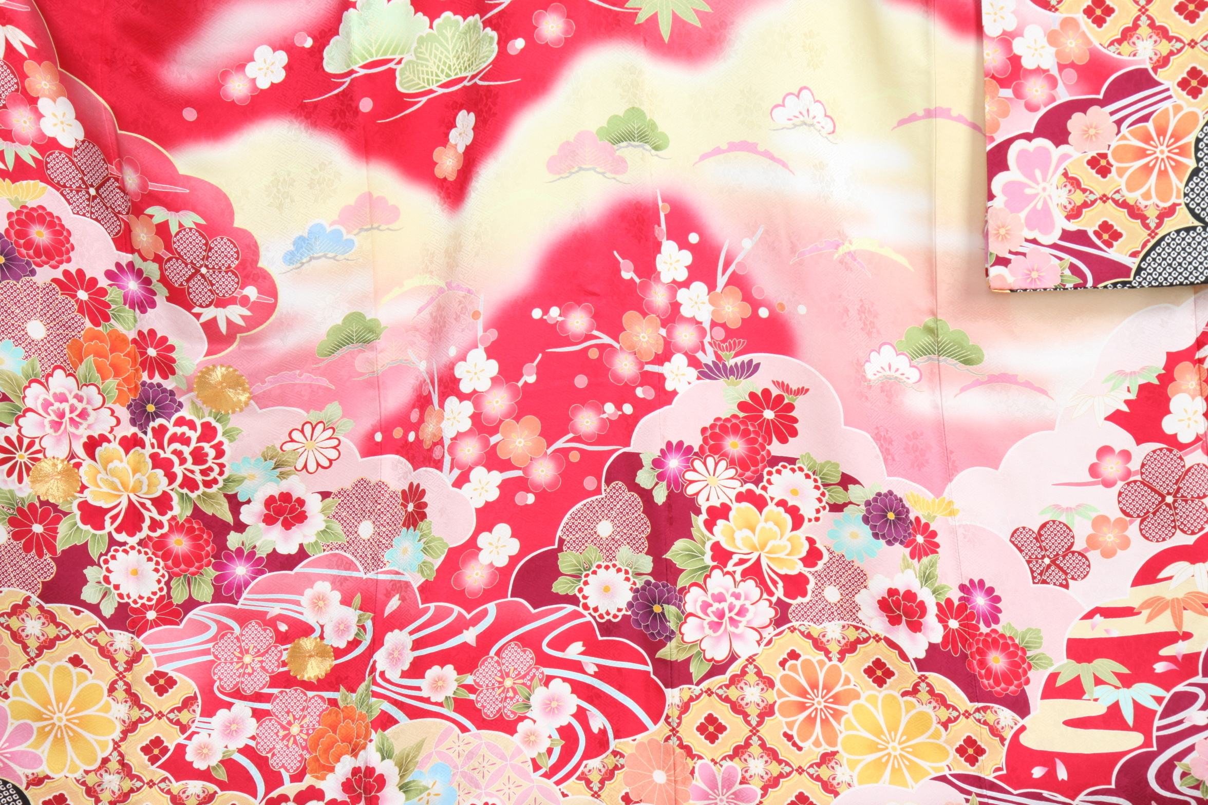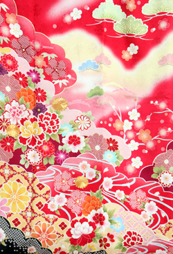赤地に山水のような染め分け、京友禅の金箔加工が豪華な印象のお振袖。