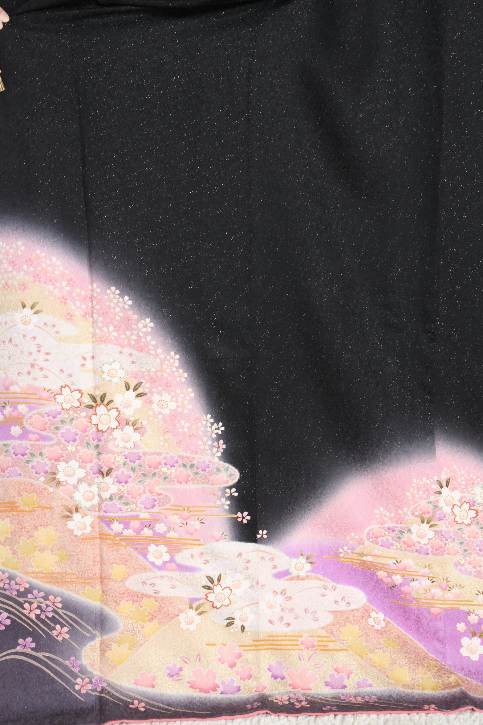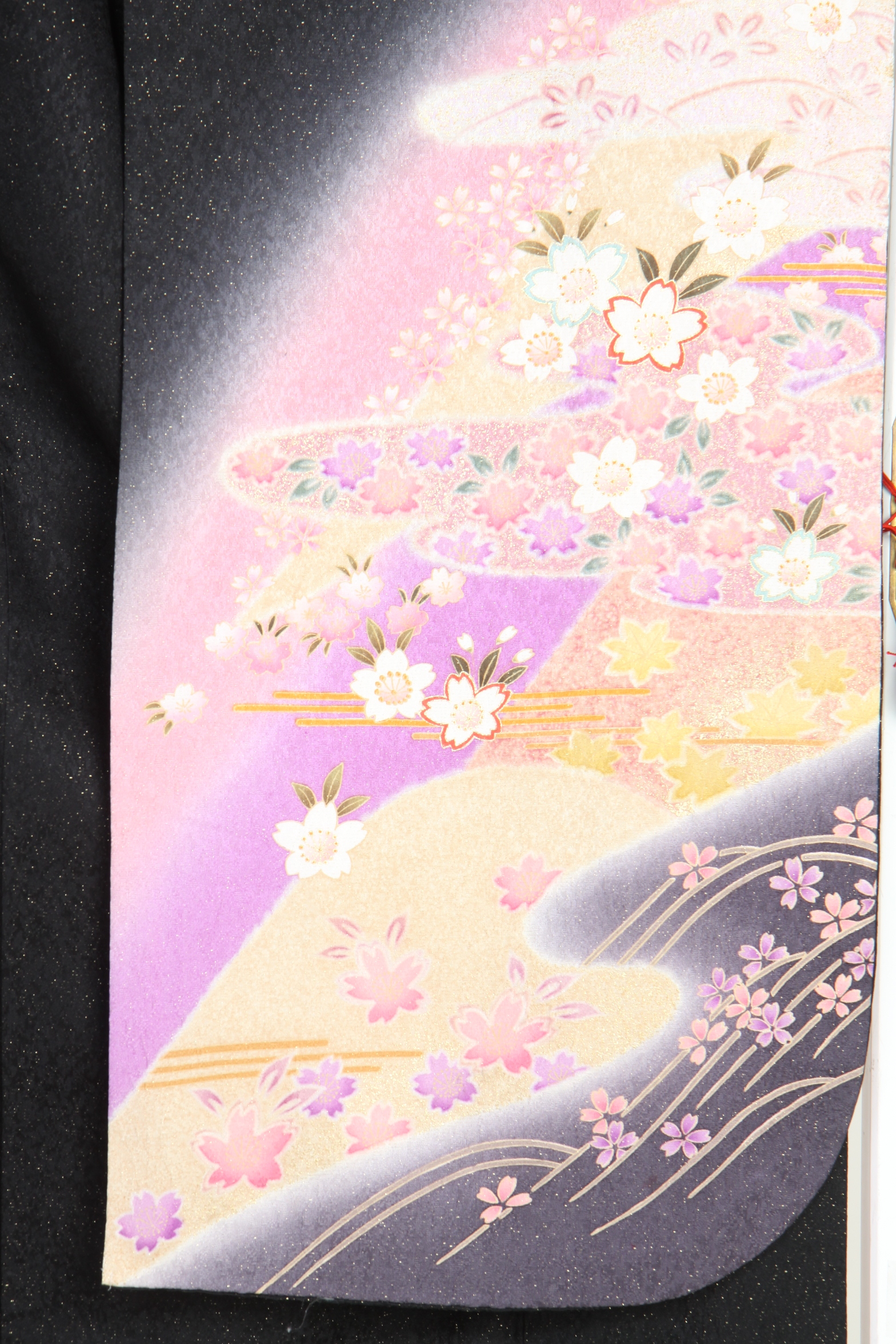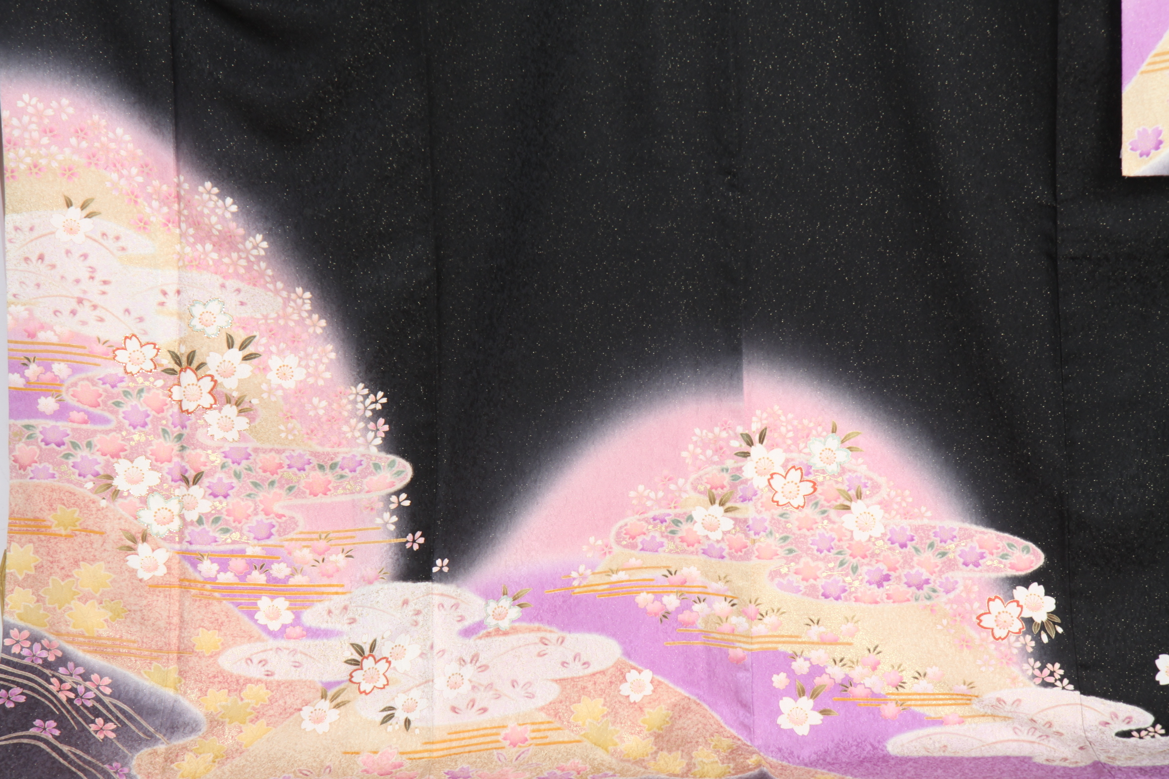 黒地に紫の染め分け、その上に四季の花を散らした正統派の振袖。