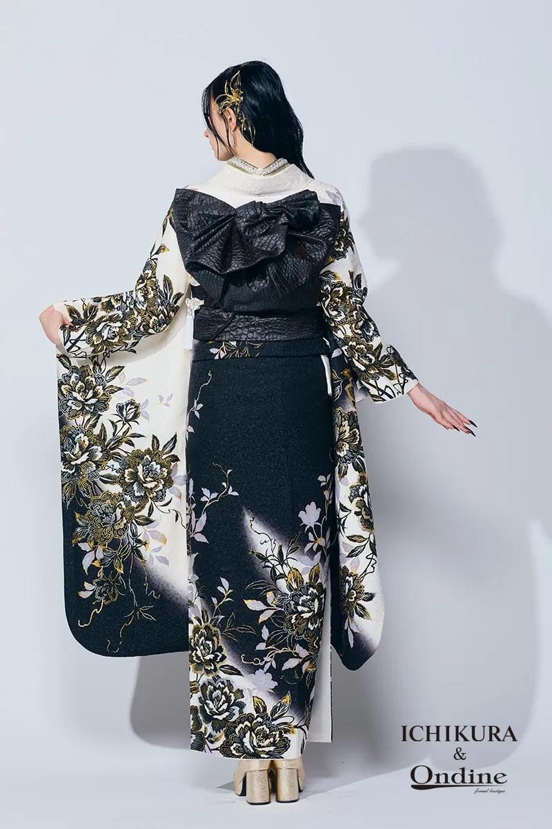黒いベルベットに薄金の刺繍、白と黒のコントラスト、シルバーラメとゴールドラメの輝き、女性の好むものを惜しみなく取り入れた振袖です。