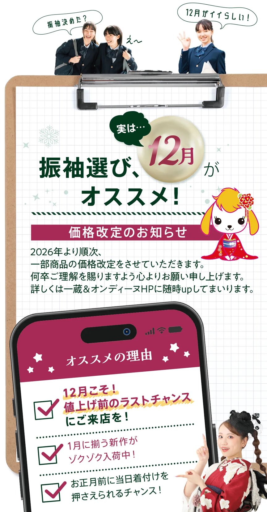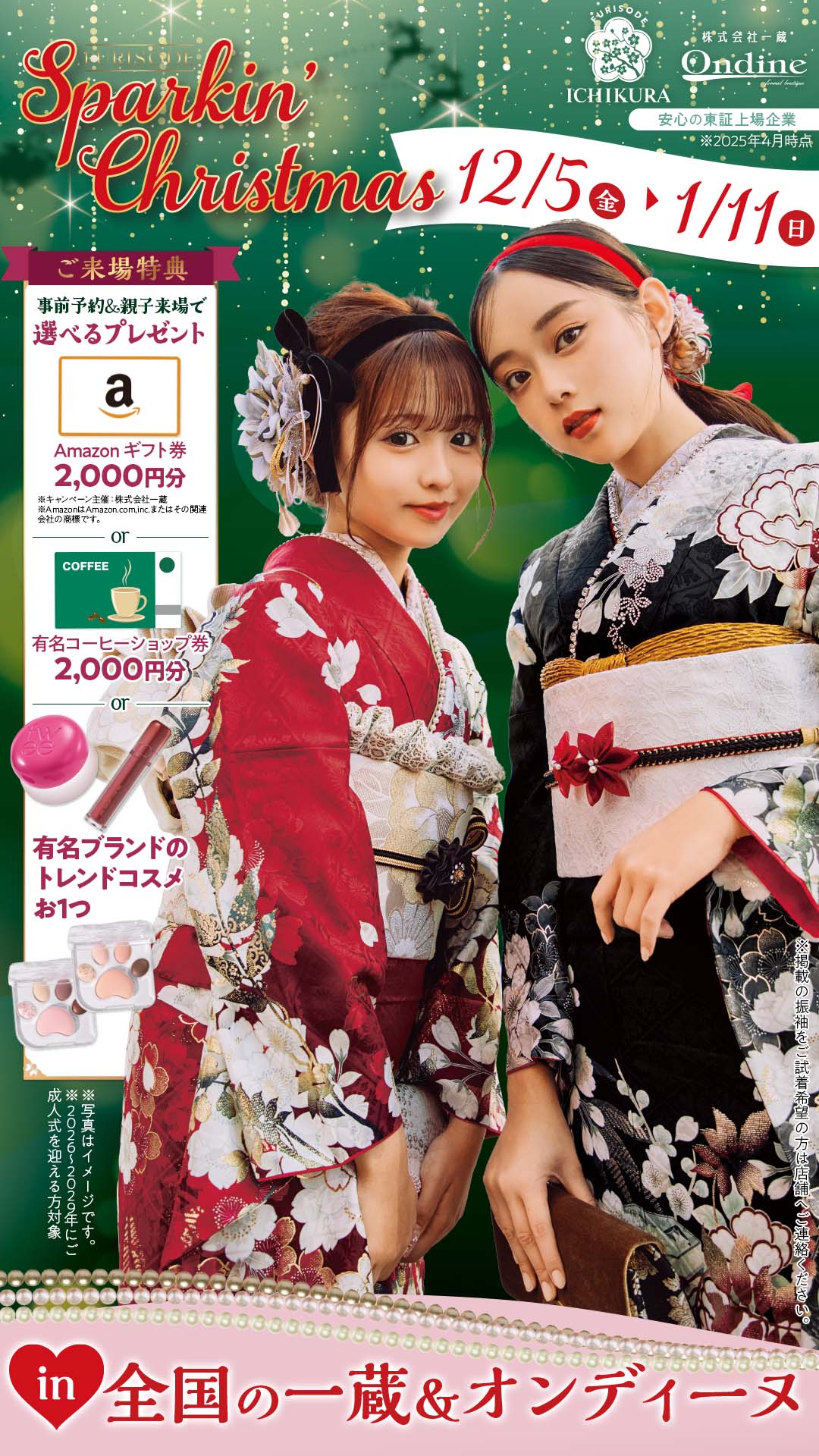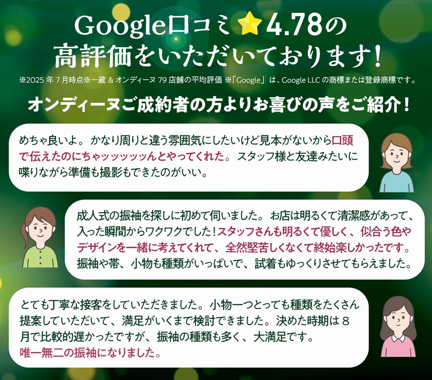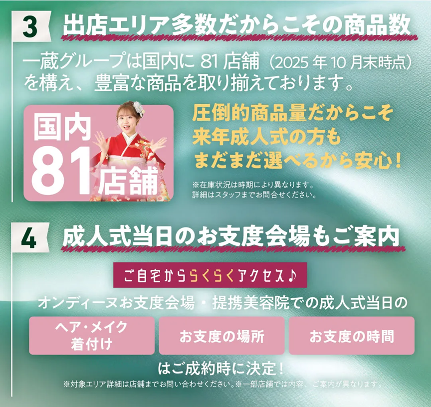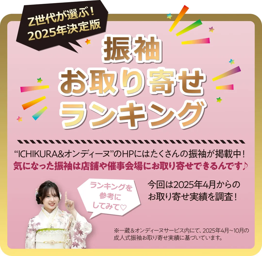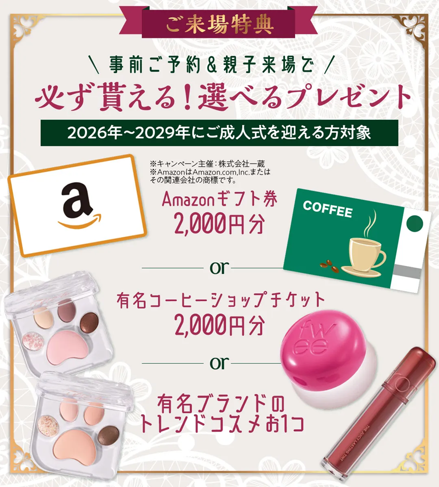 ※写真・イラストはイメージです。※再来場の方は対象外です。※色・デザインはお選びいただけません。※在庫状況によりお選びいただけない場合がございます。予めご了承ください。※2026~2029年に成人式を迎える方が対象となります。※株式会社一蔵が主催するその他振袖イベントでの併用はできません。
