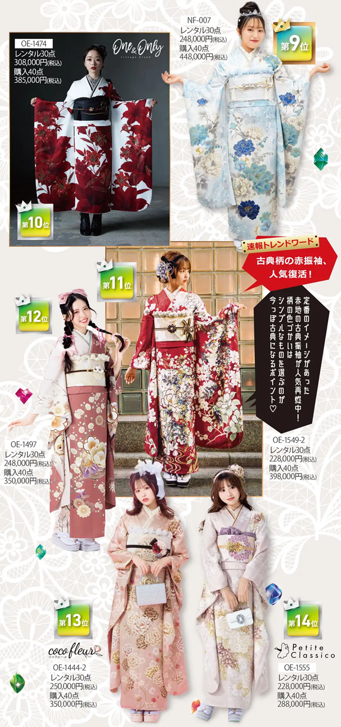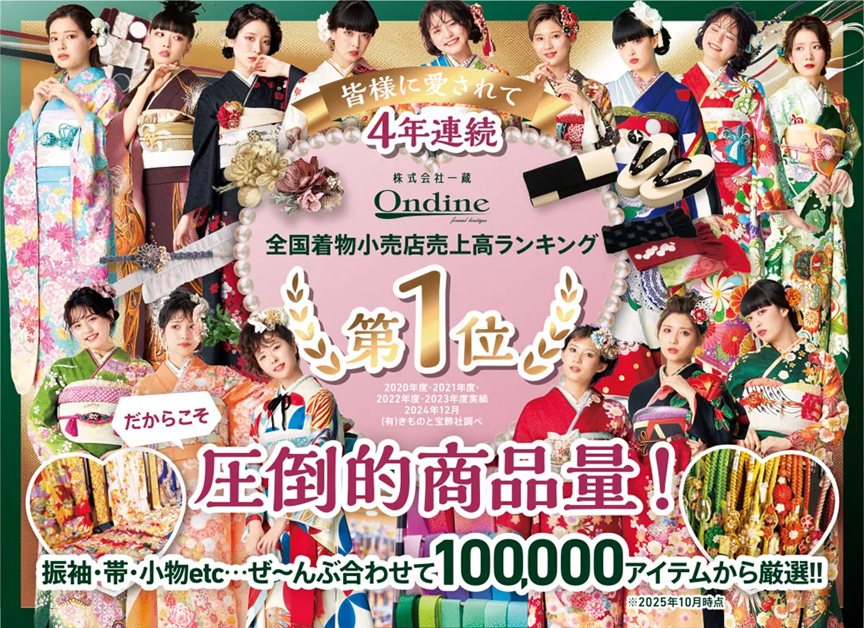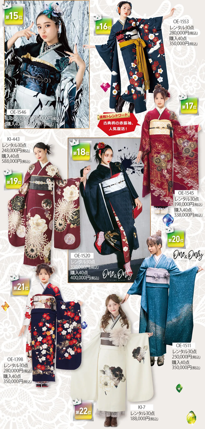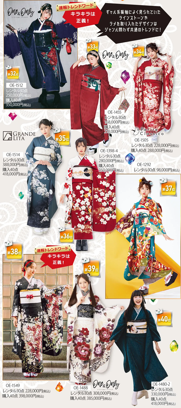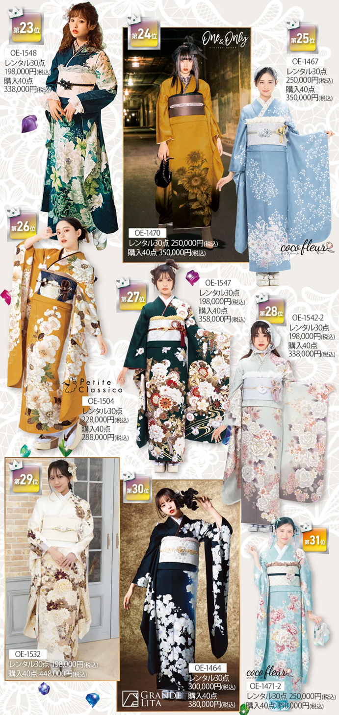 ※掲載の振袖コーディネートの袋帯・その他小物は全てグレードアップ品を使用しています。グレードアップ品詳細は、オンディーヌのWEBページよりご確認ください。※セット内容詳細は、「30点レンタルスタンダードセット」「40点購入スタンダードセット」をご参照下さい。※ご予約が込み合った際にはご希望の日程に商品をご用意できない可能性がございます。詳しくは店舗にお問い合わせください。
