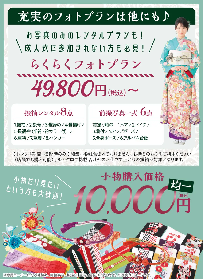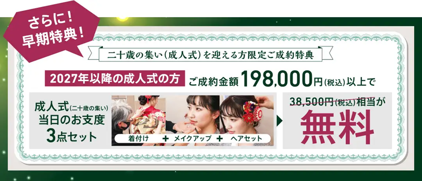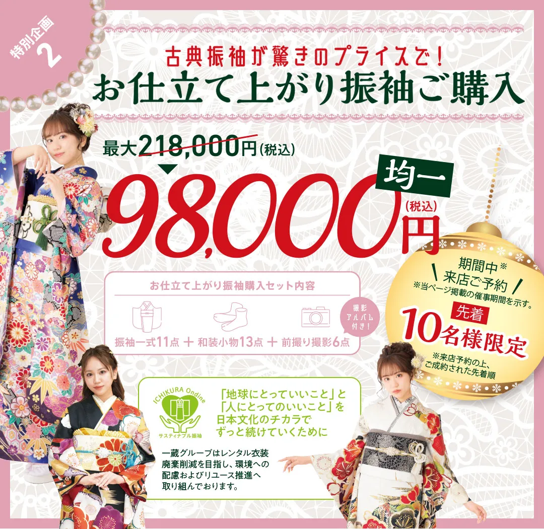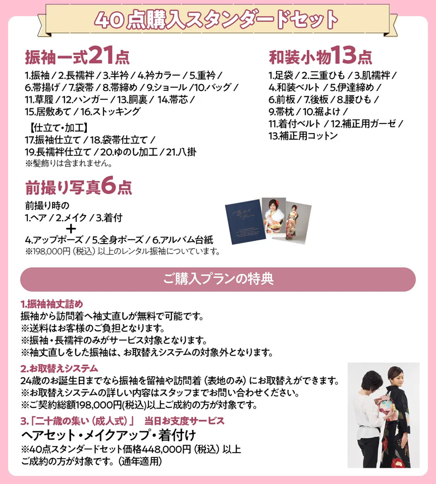 ※2026年成人式の方は40点購入スタンダードセット価格448,000円(税込)以上をご成約の方に限ります。※企画・キャンペーン商品をご成約の方は対象外です。※一部対応していない店舗がございます。※画像はイメージです。