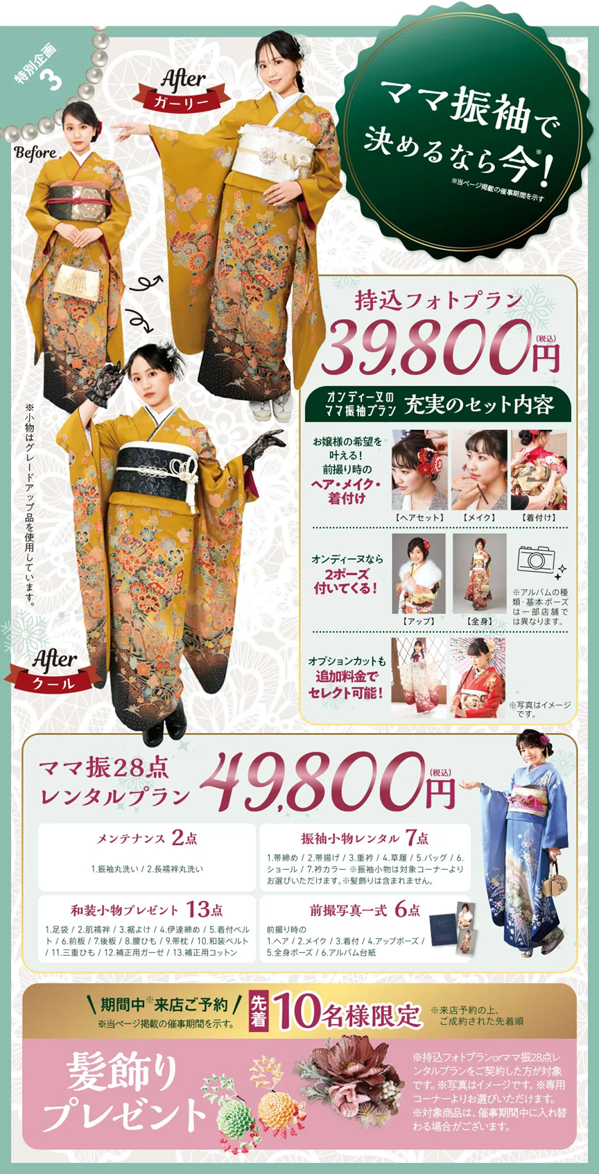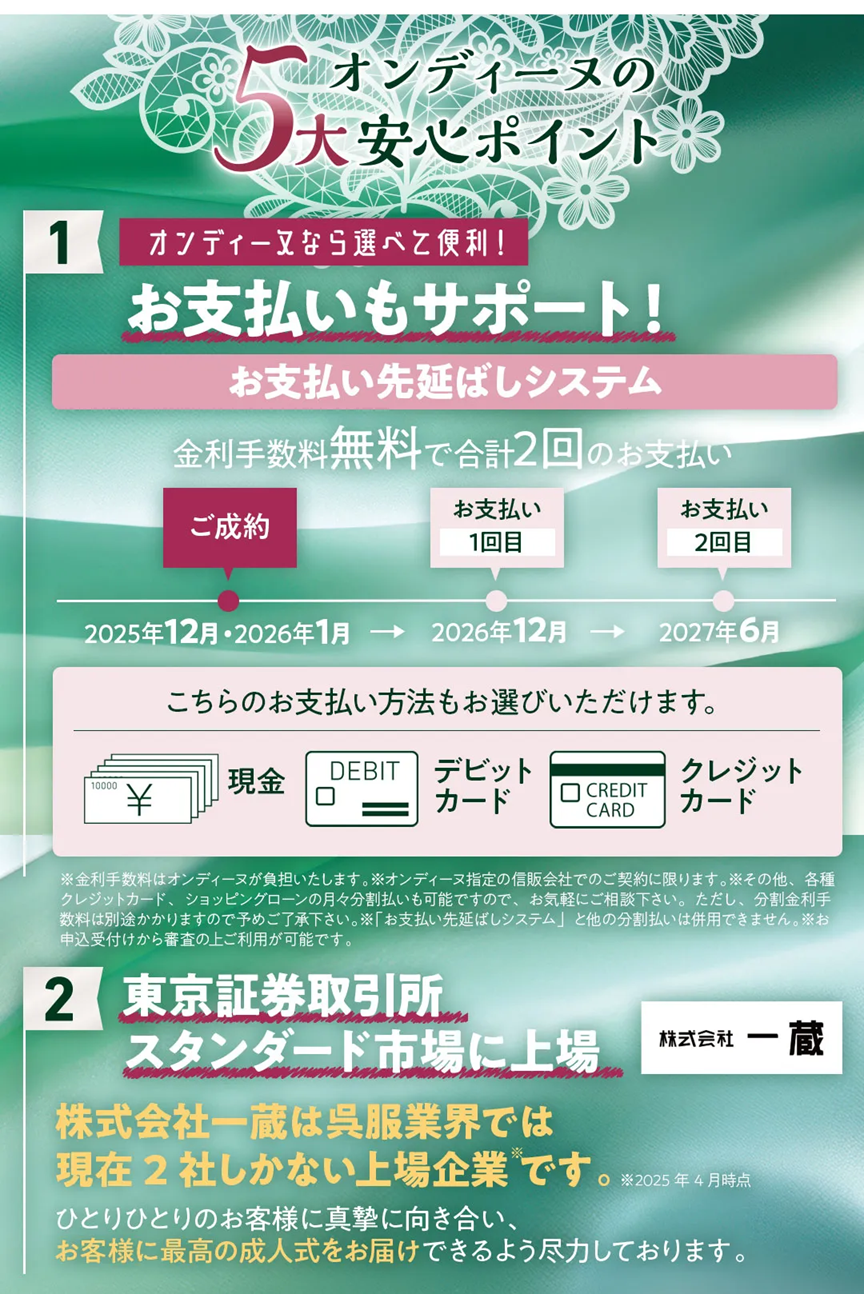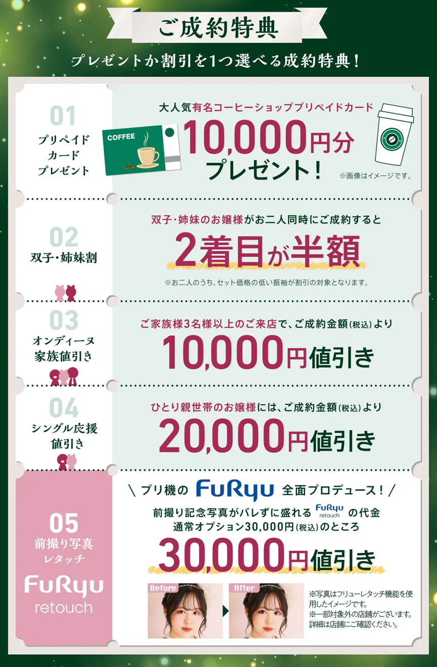 ※2026年成人式の方は40点購入スタンダードセット価格448,000円(税込)以上をご成約の方に限ります。※企画・キャンペーン商品をご成約の方は対象外です。※一部対応していない店舗がございます。※画像はイメージです。