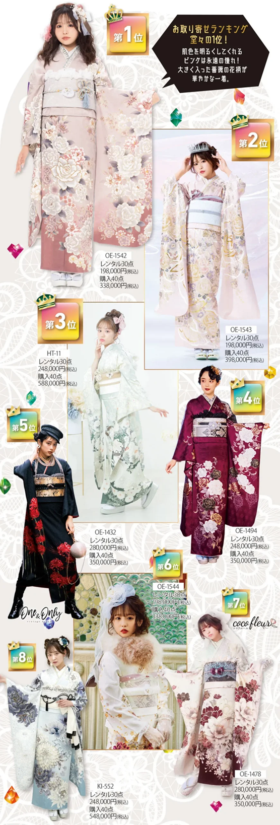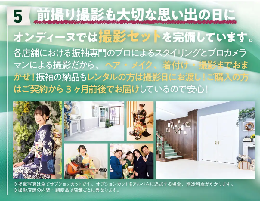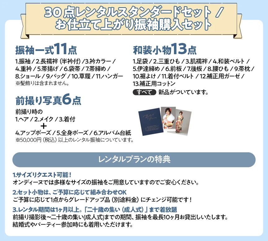 ※掲載の振袖コーディネートの袋帯・その他小物は全てグレードアップ品を使用しています。グレードアップ品詳細は、オンディーヌのWEBページよりご確認ください。※セット内容詳細は、「30点レンタルスタンダードセット」「40点購入スタンダードセット」をご参照下さい。