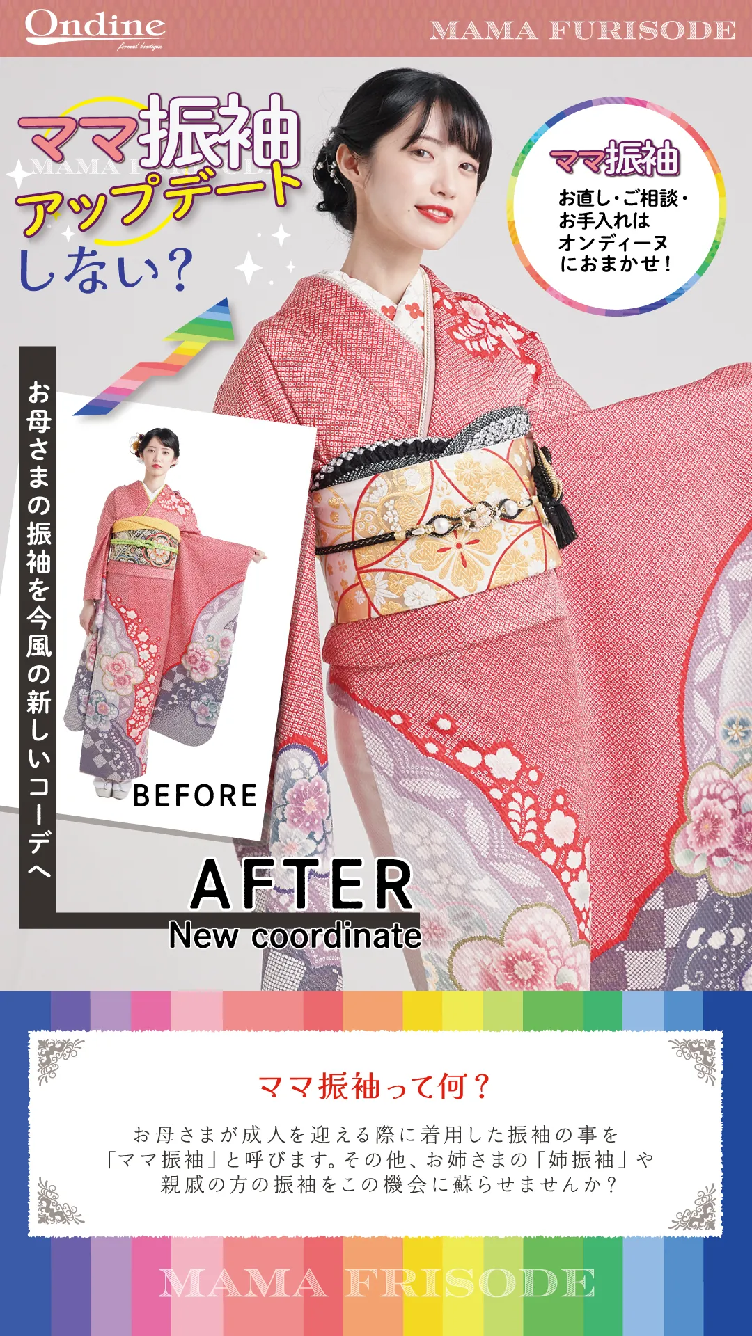 【ママ振以外もOK!】お持ちの振袖であれば、どなたの振袖でもプランの対象になります!【コーディネートチェンジ可能!】振袖コーディネーターが約1,000点の豊富な帯・小物を使用し、思い出の詰まった大切な振袖の良さを引き立てつつ、ご要望に沿ったテイストにコーディネートチェンジも可能です!※帯のみのレンタル・小物のみの販売もございます。【振袖無料診断ご対応します!】サイズやシミ・汚れなどご不安があればお気軽にご相談ください☆