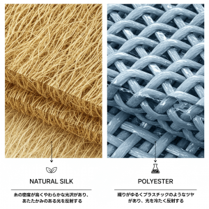 一方で、糸をしっかり織り込んだ生地は光を柔らかく拡散し、落ち着いた上品な艶を生み出します。