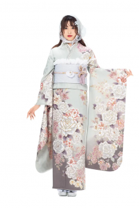 おすすめは、裾から袖にかけて柄が流れるように配置された総柄・絵羽模様。視線が縦に流れ、スッと背が高く見える効果があります。