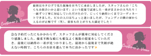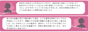 なんばエリアは、ショッピングのついでに下見や試着をしやすいロケーションが人気。「振袖はよくわからない…」という方でも、親身なスタッフが丁寧に相談にのってくれるから安心です。