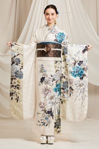 やわらかな生成色の地に、墨絵のようなタッチで描かれた大輪の菊や芍薬。淡墨の花々に、深みのある青と群青の差し色が静かな存在感を放ちます。
