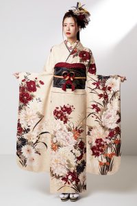 お祝いの席にふさわしい「束ね熨斗」や「四季の花々」が描かれ、格式高い美しさを演出します。誰からも愛される、二十歳の門出に相応しい王道スタイルです。