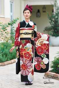 凛とした漆黒をベースに、鮮やかな赤と豪華な金駒刺繍で描かれた大柄の菊や梅が咲き誇る一着。