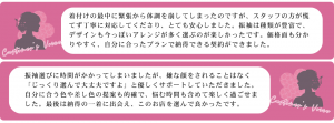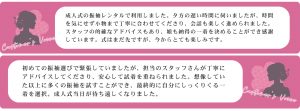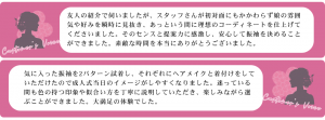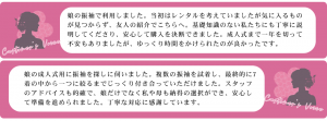● 長期サポート: 購入後も着用相談やクリーニング対応。