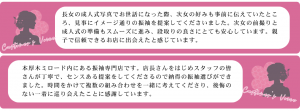 ● 地域密着の安心: 地元での成人式事情を熟知したスタッフが対応。