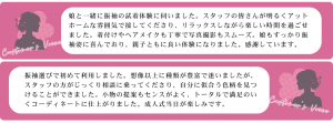 ● 当日支度サポート: 成人式当日の着付け・ヘアメイクを手配。