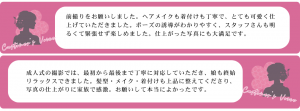 ● 前撮りサポート: 着付け・ヘアメイク対応。写真付きプランの媒体掲載は39,800円~