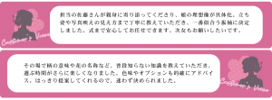 試着を重ねながら小物の配色まで丁寧に提案してくれるので、初めてでも段取り良く準備が進められます。