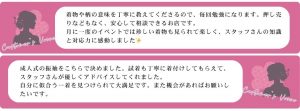 ● アフターサービス: 着用後のクリーニングやメンテナンス、次の記念日の装い相談など、振袖を長く大切に着たい方にも心強いサポート。