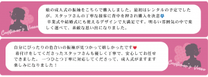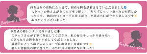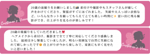 前撮りではプロカメラマンが撮影を担当し、写真館のような高品質な仕上がりに。成人式後のアフターサポートも整っており、長く信頼できるお店です。