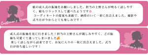 ● 撮影と衣装一括対応: 振袖レンタルと撮影を同日に完結可能。