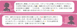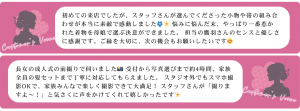 また、撮影だけでなく衣装選びもサポートしてくれるので、初めての方でも安心。家族写真の同時撮影も対応しています。