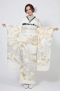 多彩な金彩加工が奥行きを生み出し、清潔感と華やかさを兼ね備えた、洗練された振袖姿へと導きます。