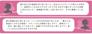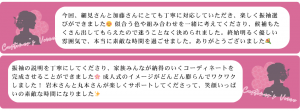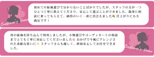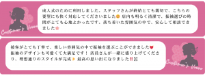 また、成人式後のアフターサービスも充実しており、着付け練習会やクリーニング相談など、卒業後も長く付き合える安心感が魅力です。