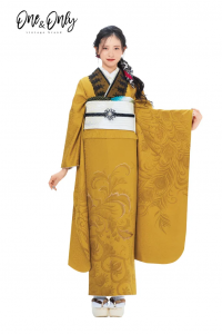 深みのある芥子(からし)色の色無地に、黒レースの衿をレイヤードした、ヴィンテージ感漂うモードな一着。一見シンプルながら、地紋に施された唐草や孔雀の羽のような文様が、光の加減でエレガントに浮かび上がります。