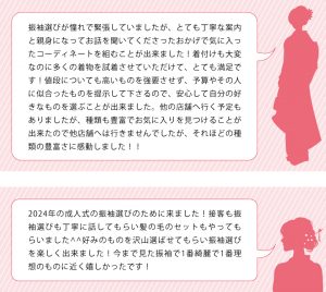 ● 今回成人式の振袖を決めに来店させていただきました。たくさんの様々な振袖があって楽しく決めさせてもらいました。コーディネートも最初から丁寧に仕上げていただき自分好みのコーディネートができました。