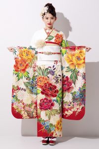 純白の地色に、牡丹や菊といった伝統的な和の花々が色鮮やかに咲き誇る、格調高い一着。古典柄の美しさを際立たせる構図が、ハレの日にふさわしい品格と華やかさを演出しています。