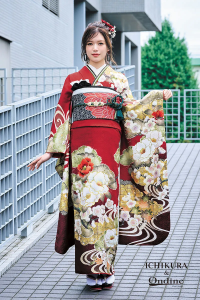 魅惑的な深紅をベースに、裾に向かって深みのあるえんじ色を効かせた振袖。白や金で大胆に描かれた大きな花々が、洗練されたシックな佇まいを演出しています。