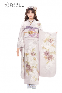2025年新作振袖★ピンクベージュ地に咲く大輪の花をプラチナ金彩で縁取って。小物使いで魅せる、可愛さとおしゃれ感のバランス。
