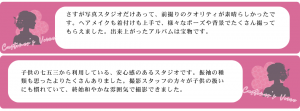 写真のプロならではの多彩なスタジオセットや撮影技術で、モデルのようなクオリティの高い記念写真を残したい方に特におすすめです。