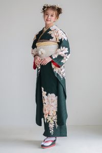 黒の帯やレース小物をアクセントに効かせることで、甘さを抑えたエッジィでスタイリッシュな着こなしが完成します。クールで華やかなヒロインになりたいお嬢様にイチオシのデザインです。