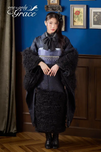 落ち着いた濃紺の地色に、袖と裾へたっぷりとあしらわれた黒のフリルがドラマティックなボリューム感と華やかさを演出する一着。シックでありながら大胆なデザインは、レザーブーツや首元のリボンを効かせた洋風のモードなスタイリングと相性抜群です。周りと一線を画す、甘すぎない大人の華やぎを求めるお嬢様におすすめします。