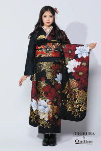 漆黒のキャンバスに、深紅と白の大輪の花、そして煌びやかなゴールドの文様が大胆に描かれたゴージャスな一着。メリハリのある「黒×赤×金」のカラーリングが、圧倒的な存在感と大人の色気を引き出します。