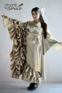 シャンパンゴールドのサテン生地が放つ、上品でまばゆい輝きが目を引く一着。たっぷりとあしらわれたボリューミーなフリルと、袖口から覗く繊細なレースが、まるで西洋のドレスのような究極の優雅さを演出します。和装の枠を越えた気品あふれるドレッシースタイルで、特別な一日を映画のヒロインのようにドラマティックに彩ります。