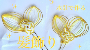 100均のご祝儀袋の水引でも代用可能。動画では、結んだ水引をワイヤーで固定し、Uピンに取り付けるまでの流れが丁寧に解説されています。