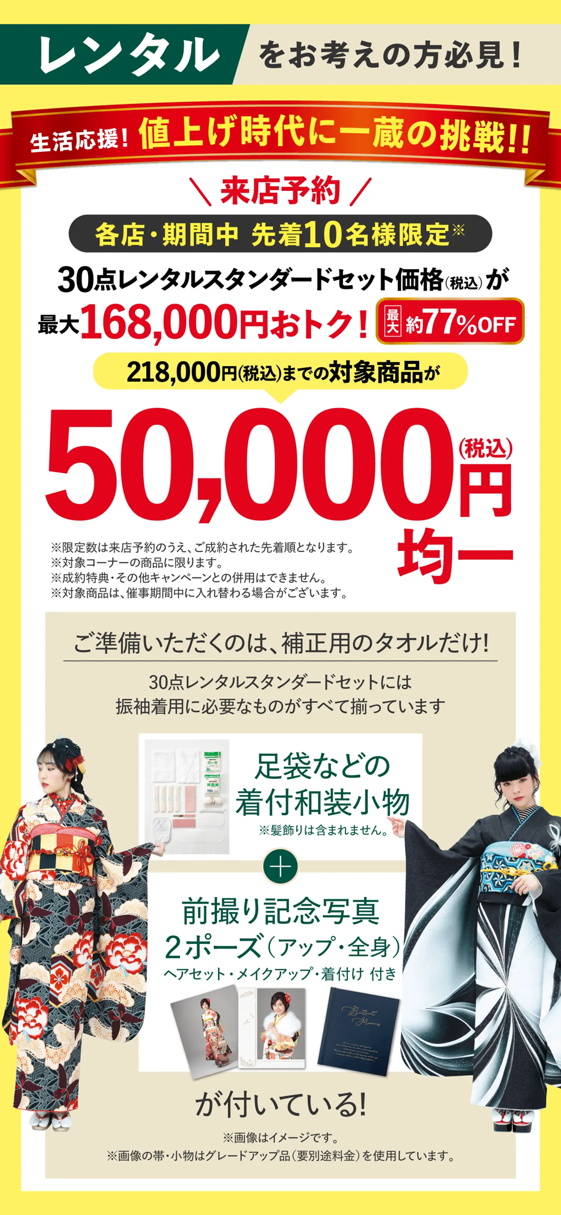 振袖・帯・小物も含め、商品総保有数約10万点の圧倒的商品量と、