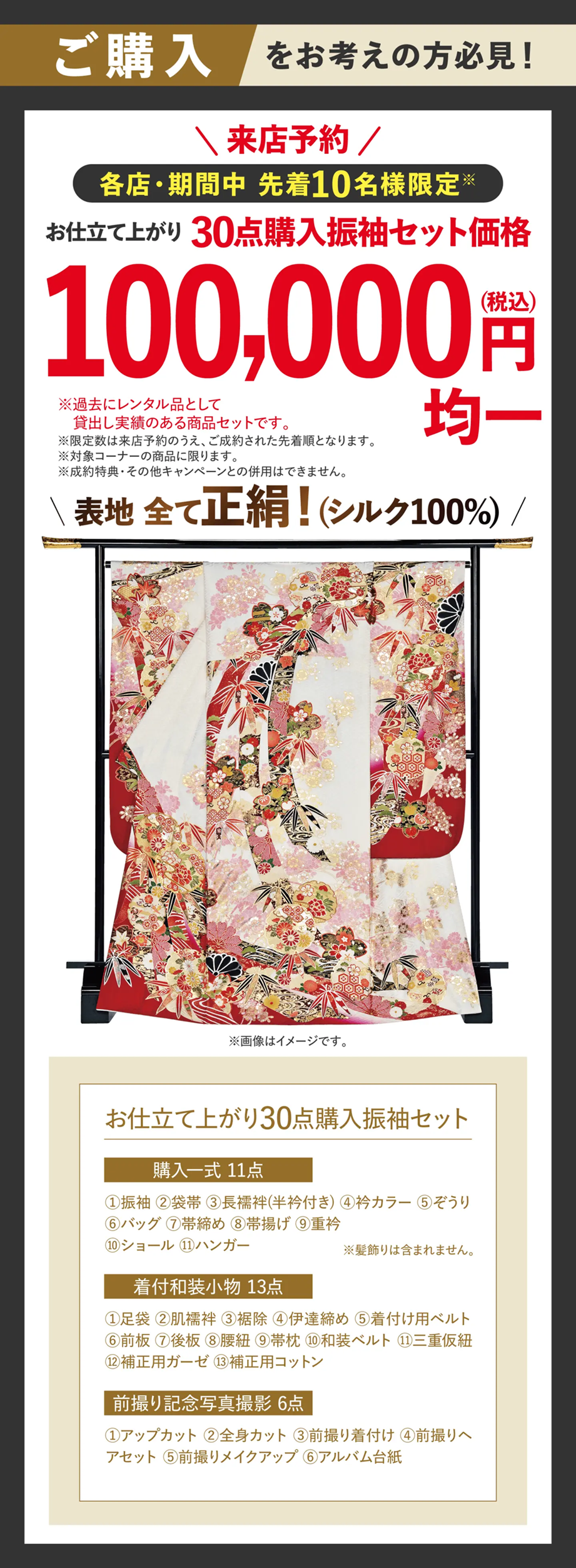 振袖・帯・小物も含め、商品総保有数約10万点の圧倒的商品量と、