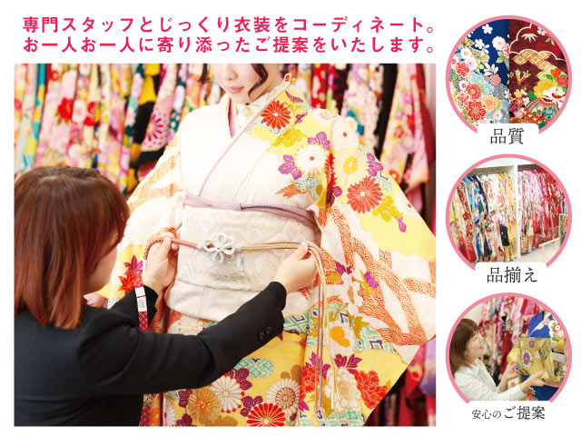 「振袖や小物など少なかったり、コーディネートもセットになっていて選べない」 という声をよく聞きますが、当店ではそのようなことは一切ございません。 振袖や小物など何処よりも多くございます。 きっと素敵なものに出会えるはず!