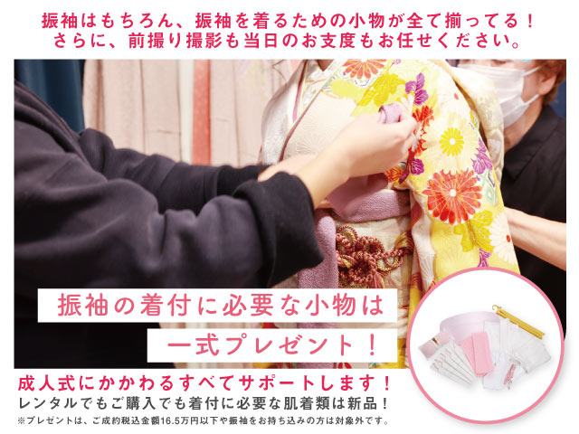 成人式当日のお支度もお任せ下さい!プロのスタッフが着崩れしづらく余分な締め付けがないよう着付いたします。 またヘアメイクで振袖姿を華やかに!お客様のご希望を伺いながら仕上げていきます。 成人式を快適で素敵な一日として過ごせるようお手伝い致します。