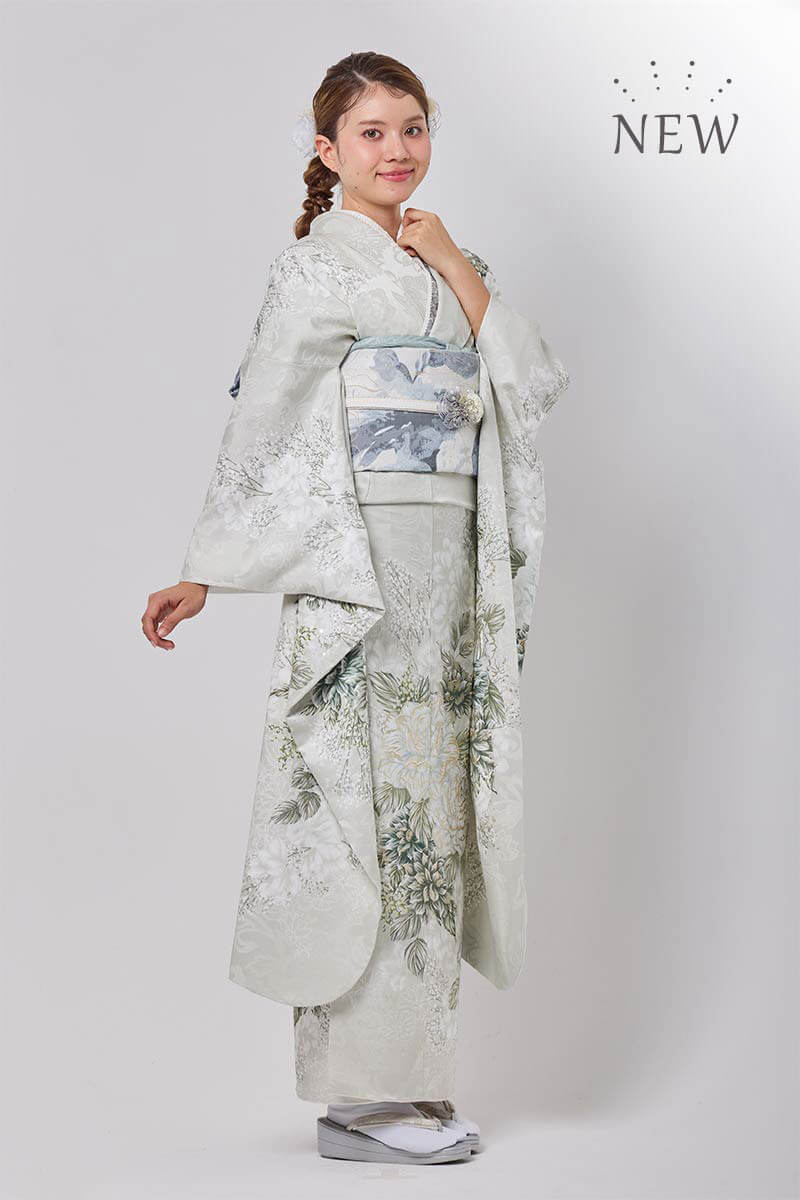 【MK-1309】鼠色の地に白い和花柄を合わせた振袖