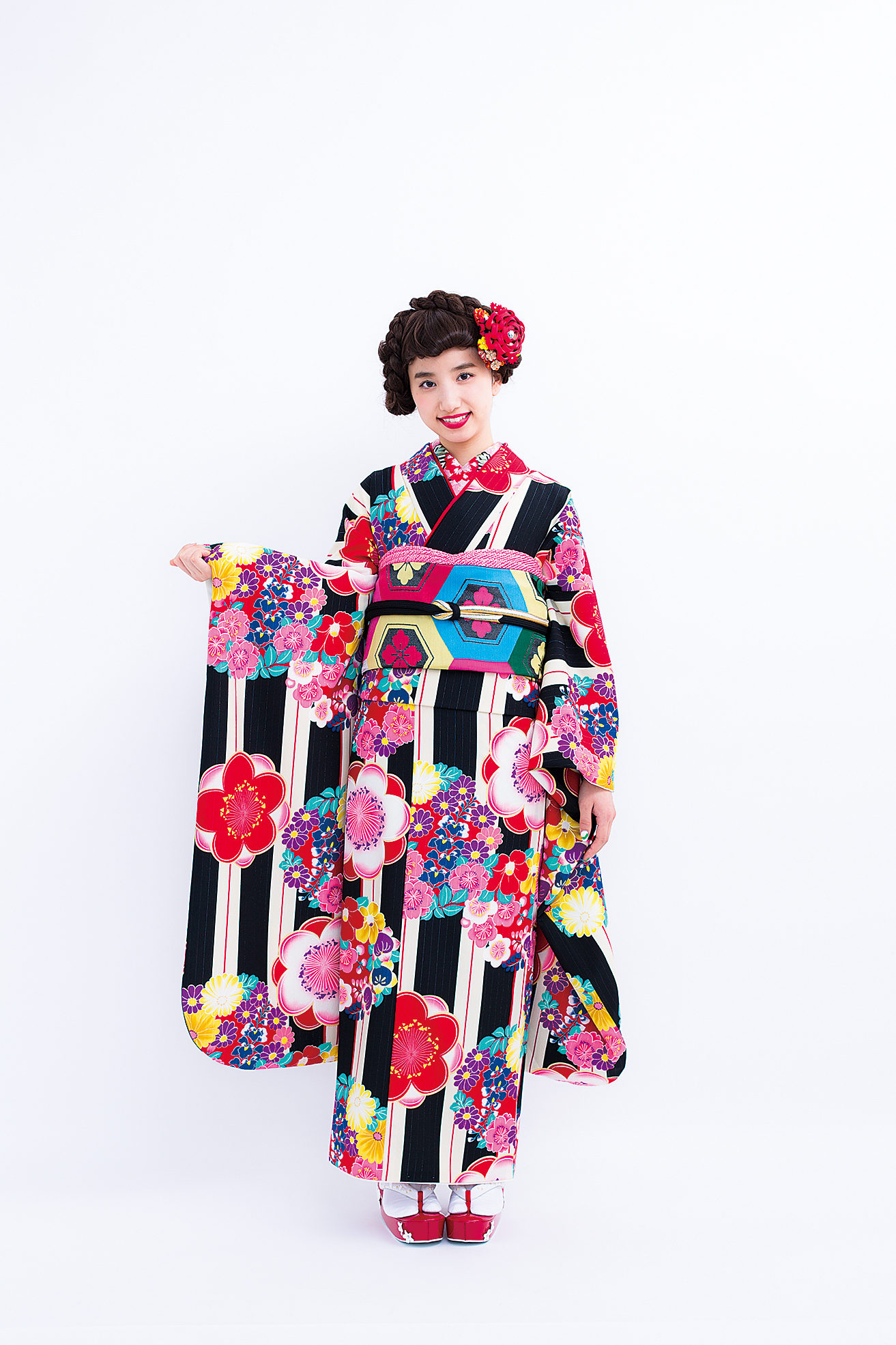 (撮影時のヘアセット・メイクアップ・着付け)+写真2ポーズ(アップ・全身)+アルバム台紙+振袖8点セット(①振袖②袋帯③帯締め④帯揚げ⑤長襦袢⑥重衿⑦草履⑧ハンガー)