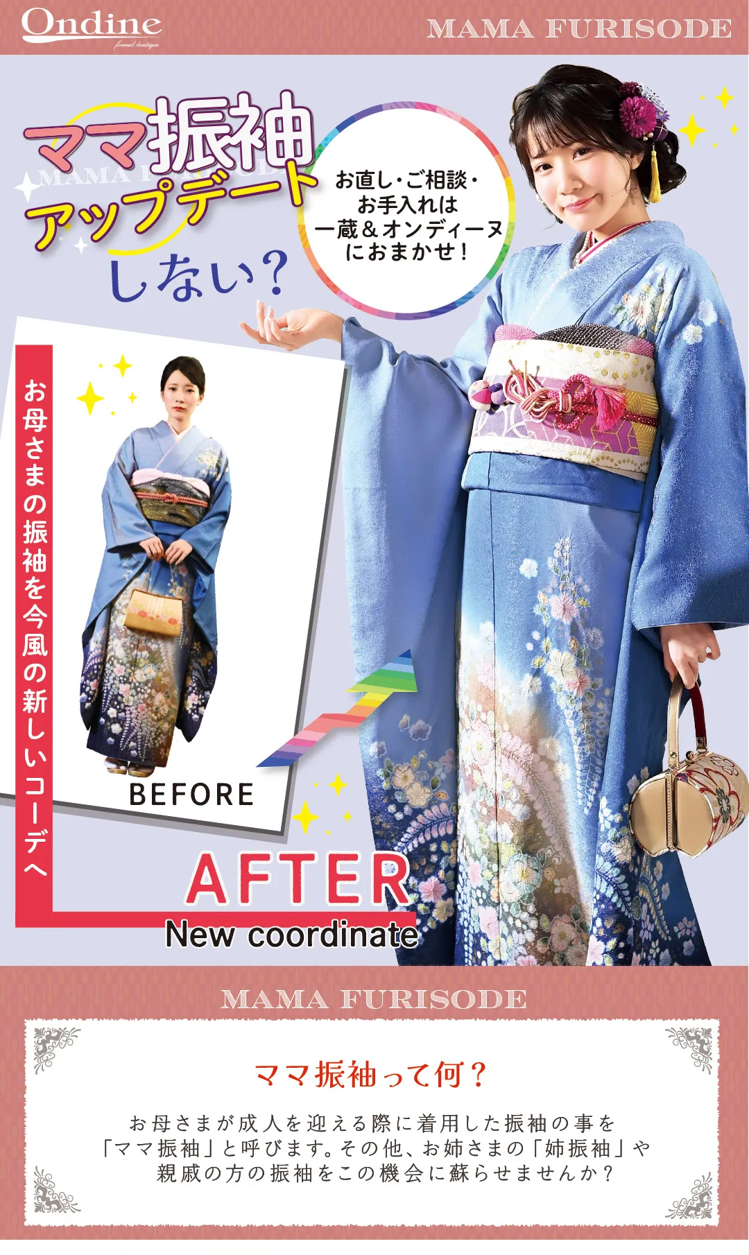 【ママ振以外もOK!】お持ちの振袖であれば、どなたの振袖でもプランの対象になります!【コーディネートチェンジ可能!】振袖コーディネーターが約1,000点の豊富な帯・小物を使用し、思い出の詰まった大切な振袖の良さを引き立てつつ、ご要望に沿ったテイストにコーディネートチェンジも可能です!※帯のみのレンタル・小物のみの販売もございます。【振袖無料診断ご対応します!】サイズやシミ・汚れなどご不安があればお気軽にご相談ください☆