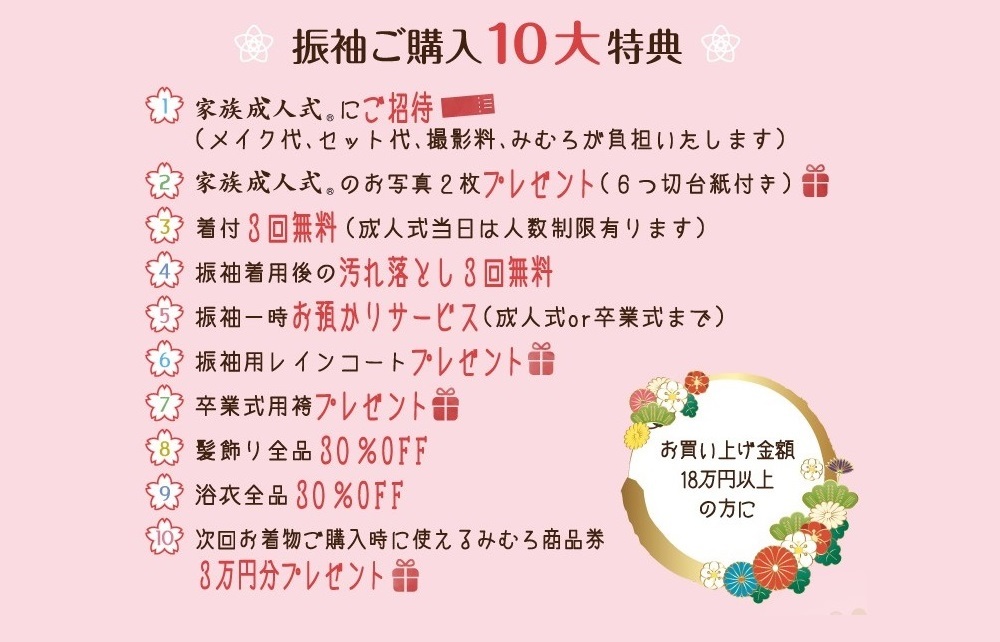『きてよかった』そう思える振袖を‥‥ オリジナルキモノ みむろなら、あなたのお気に入りを必ず見つけます! 店内にはカタログには載っていない振袖が300点以上‼ もし店内に気に入った振袖が無くても全国のメーカーからお気に入りの一枚をお探し致します‼ みむろならではの品質と豊富な品数。振袖¥35.000~ 袋帯¥16.000~の安心安価‼ レンタルするよりお安くお気軽にお求めいただけます!